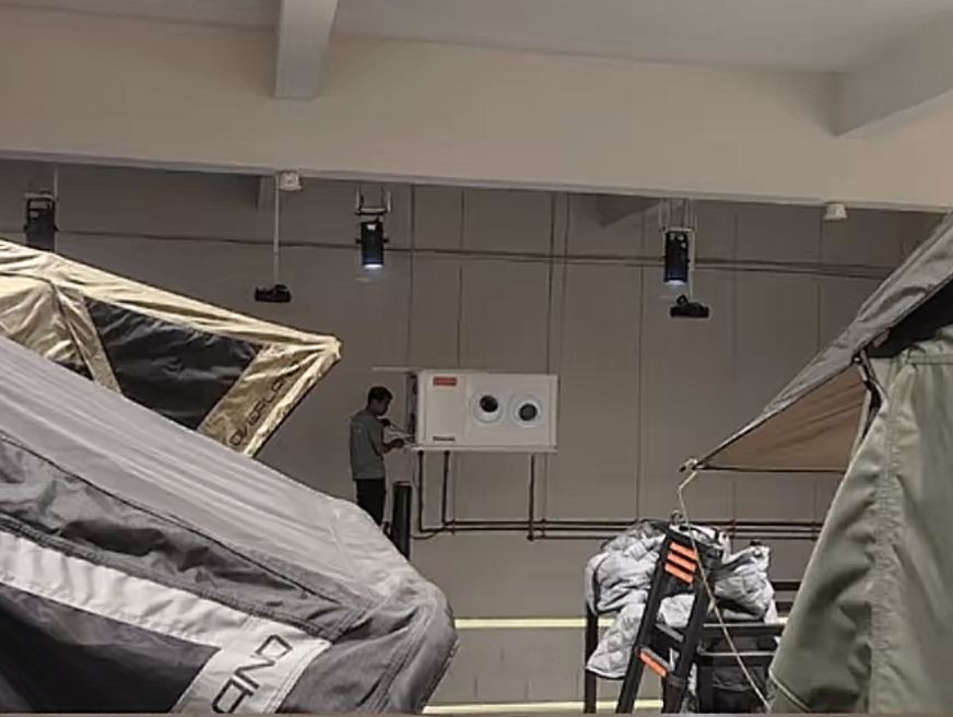 永康车顶帐篷1000㎡展厅设计安装3台10匹吊顶式射流机组,室内设计温度:22℃,风量大送风远、送风距离达到30米。