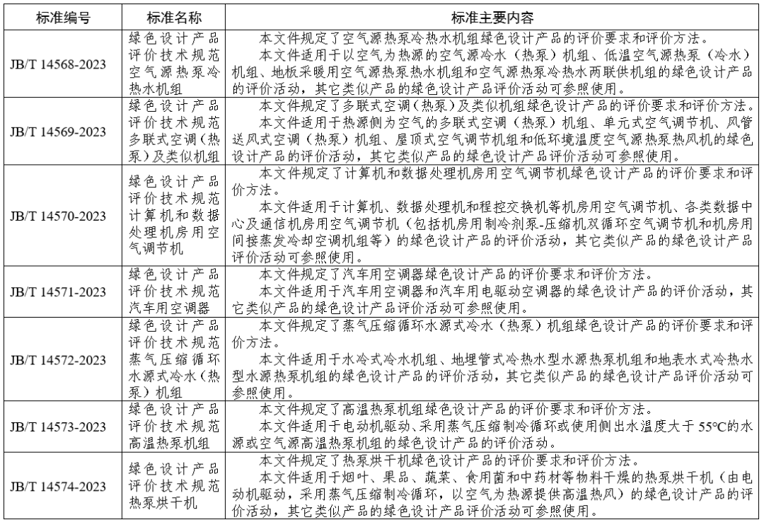 由全国冷冻空调设备标准化技术委员会归口的JB/T 14568-2023《绿色设计产品评价技术规范 空气源热泵冷热水机组》等7项行业标准正式发布,并将于2024年7月1日起实施。